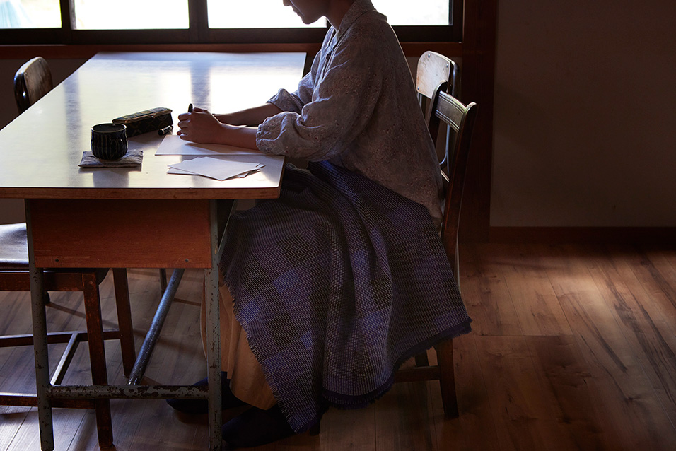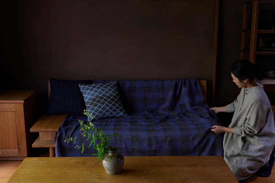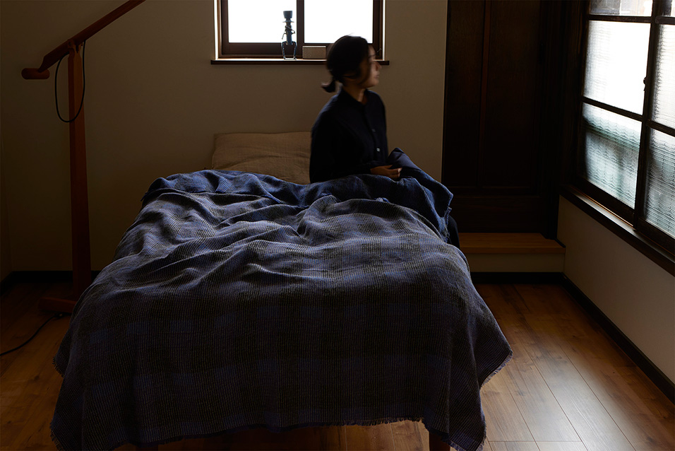 少し肌寒い朝、エイッと弾みをつけて起き上がる。二度寝の誘惑を振りほどいてくれるのは、ベッドスローとして広げた最愛の布。そのぬくもりをふわりと体に巻きつけたら、窓を開け放って深呼吸。ひんやり澄んだ外気とふっくらした布の風合いが、からだをやさしく目覚めさせてゆく。さあ、朝のコーヒーを入れましょう。