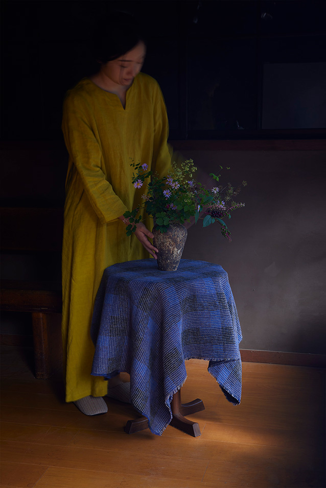 里山から持ち帰った野の花を手に、ひと思案。ふと思い立って、古びたアンティークテーブルに一枚の布をかけてみた。それは、ひたむきに咲く花々のためにしつらえた舞台。今しか会えないこの色や姿が、空気までみずみずしくしてくれる。いつまでも眺めていたくなる景色が、私の部屋に生まれた。