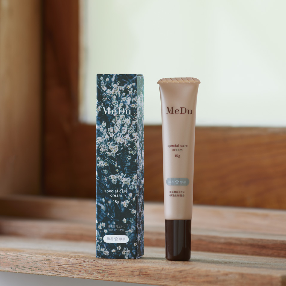 石見銀山に咲く梅の花から授かった「梅花酵母」。そのすぐれた美肌効果の研究から生まれたMeDuの基本思想は、「肌を甘やかさないシンプルケア」。毎日のお手入れは石けんで肌を洗い清め、ローションとクリームでうるおいを補給するだけです。でも年齢を重ねた肌の場合、時には「いつものお手入れでは肌の回復が追いつかない」と感じてしまうことも。そこで、そんな肌のために誕生したのがMeDuの〈スペシャルケアクリーム〉。夜、塗って寝るだけの濃密うるおいパックから、毎日朝晩のポイントケアまで、1本で2役をこなすすぐれものです。