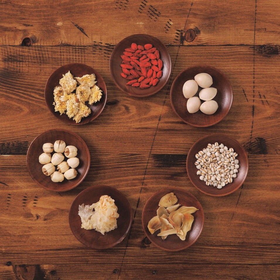 ハトムギや蜂蜜、菊花、クコの実など8つの天然食材を熟成させた〈肌糧〉は、ほんのり甘く滋味豊か。おやすみ前に一包食べて、起き抜けに白湯を飲むのがポイントです。