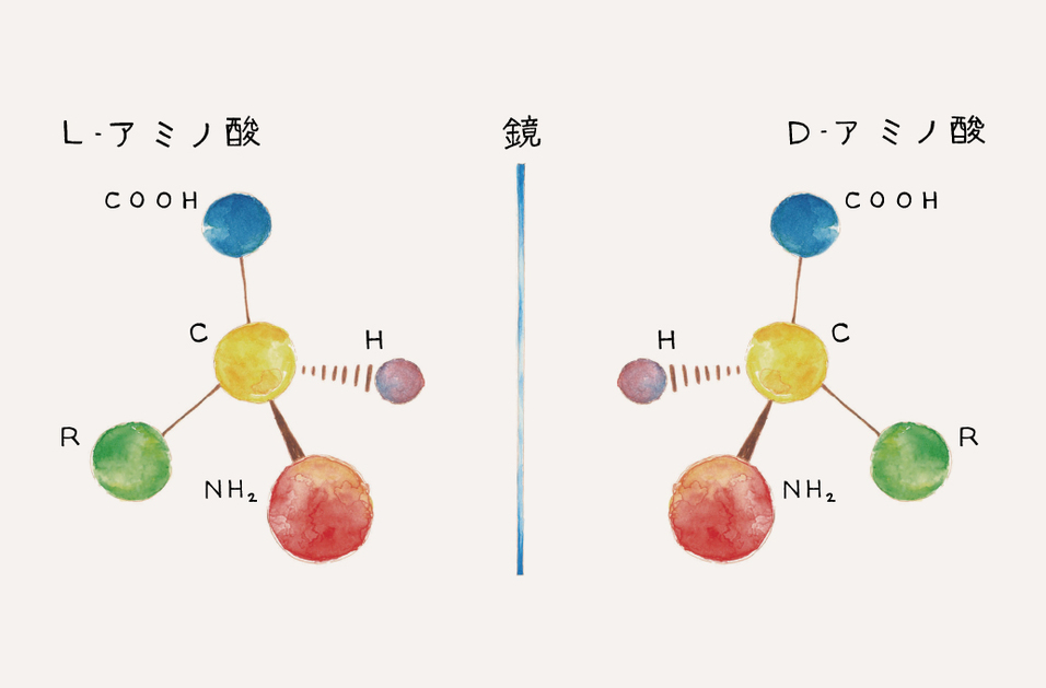 「グルタミン酸とかアスパラギン酸といった言葉を耳にされたことがあると思いますが、これらはいずれもアミノ酸の一種です。これら各種アミノ酸には、それぞれL体とD体という、まるで鏡写しになったような二種類の構造があるんです。これまで、人体内にはL体のアミノ酸(L-アミノ酸)しか存在しないと考えられていましたが、世界中で研究が進むにつれ、D体のアミノ酸(D-アミノ酸)も、生体にとって重要な働きをしていることがわかってきました」