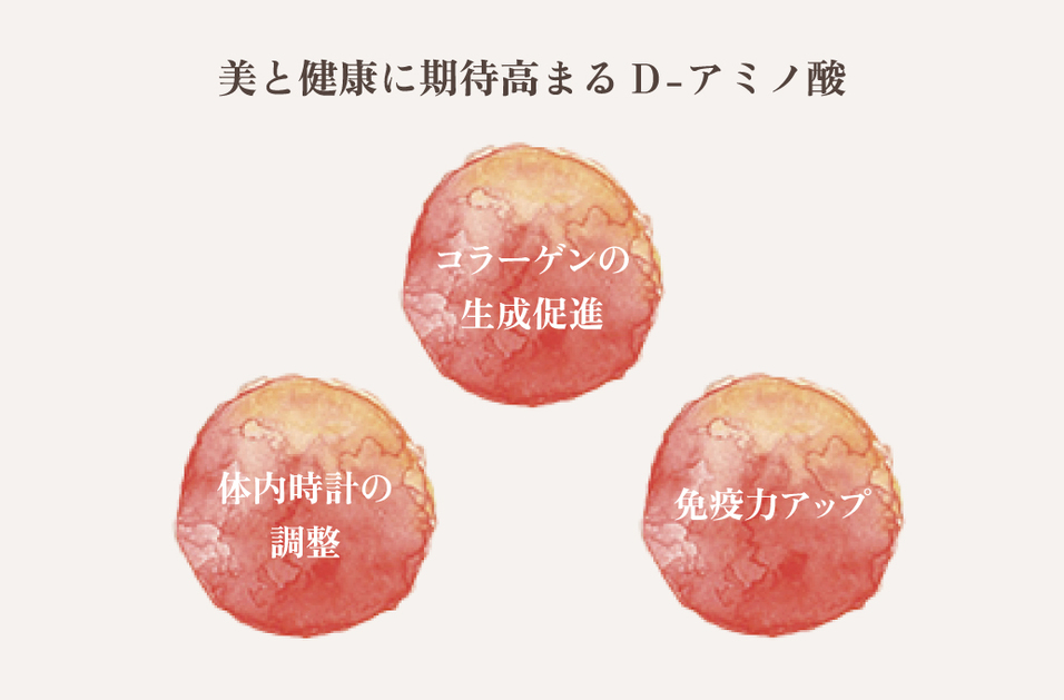 「とくに注目したいのが、肌のうるおいを守るコラーゲンの生成促進効果をもつD-アミノ酸です。また、体内時計を整える効果や、糖質代謝の改善効果、免疫力を向上させる効果などをもつD-アミノ酸も、それぞれ発見されています。私としては、このようにさまざまな効果が期待できるD-アミノ酸を、ぜひ〈肌糧〉に取り入れたいと思ったんです」