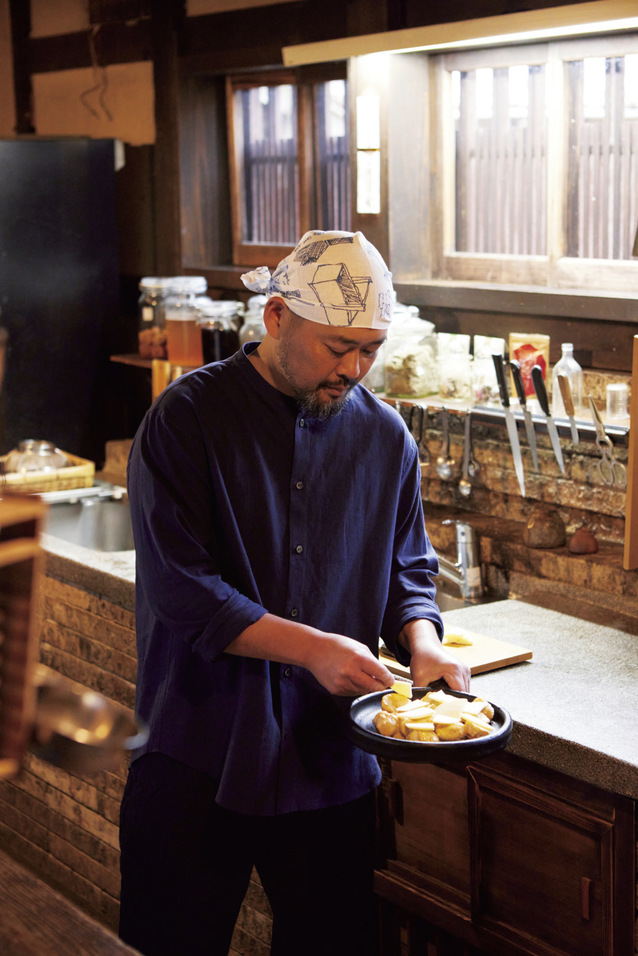 他郷阿部家の厨房に受け継がれる「里芋の玉みそグラタン」。黒土の産地で育った良質の里芋をホクホクに蒸したら、みそ、砂糖、卵黄、みりん、酒をよく練ったタレと生クリームで和え、プロボローネの薄切りをのせてオーブンへ。現在は、小野寺自身が厨房で仕込んでいる自家製みそを使っており、まろやかなコクにも一層磨きがかかっています。