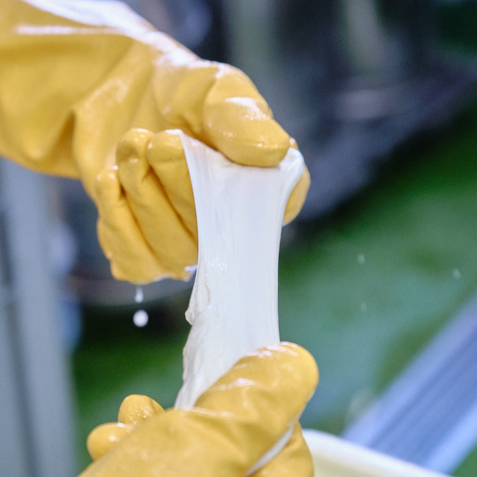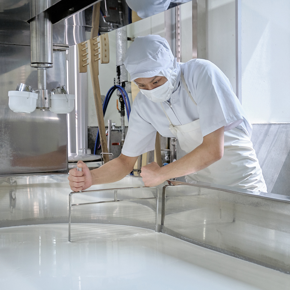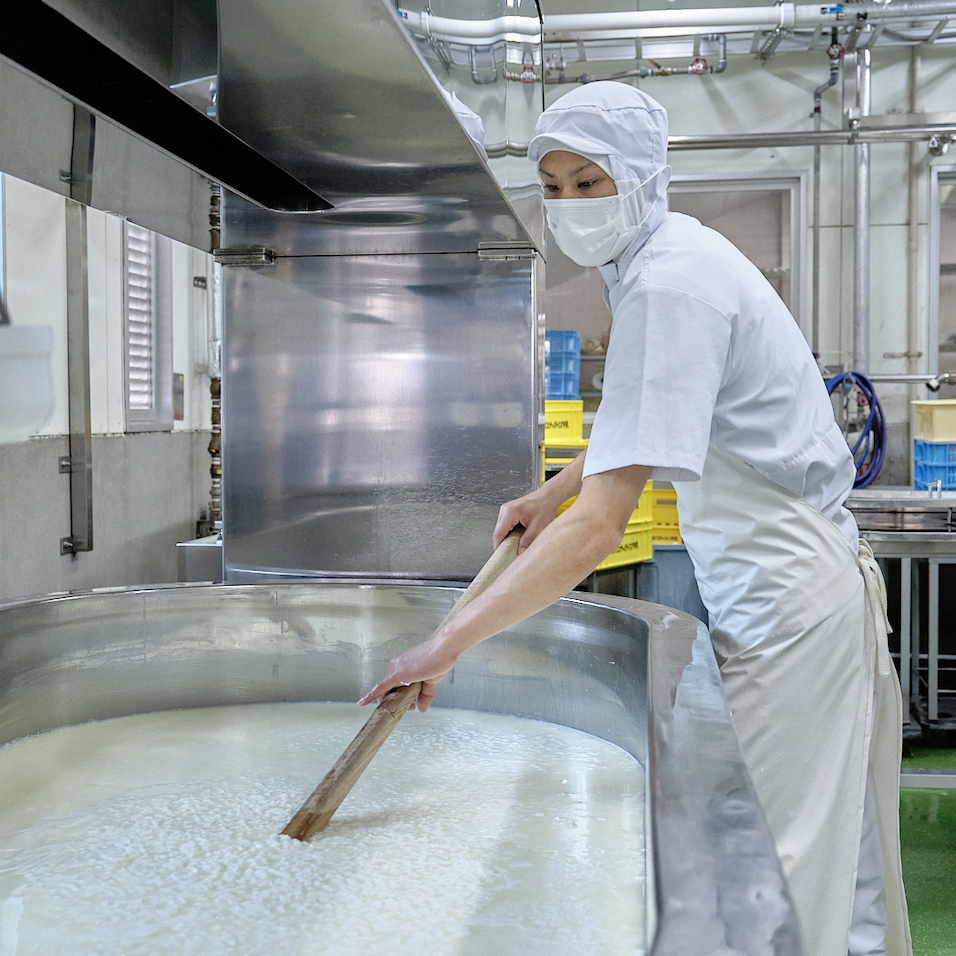 近隣の酪農家さんたちと手を取り合い、良質な牛乳づくりに取り組んでいる木次乳業さんですが、チーズ用には、その中でも選り抜きの生産者さんの生乳だけを使用しているそう。さらに看板商品であるパスチャライズ牛乳が「65℃で30分」という殺菌方法であるのに対し、チーズに使うのは、より搾りたてに近い「ノンホモ牛乳」。殺菌は72℃で15秒のみで、ホモジナイズ加工(脂肪球を小さくする均質化加工)をほどこしていないものです。