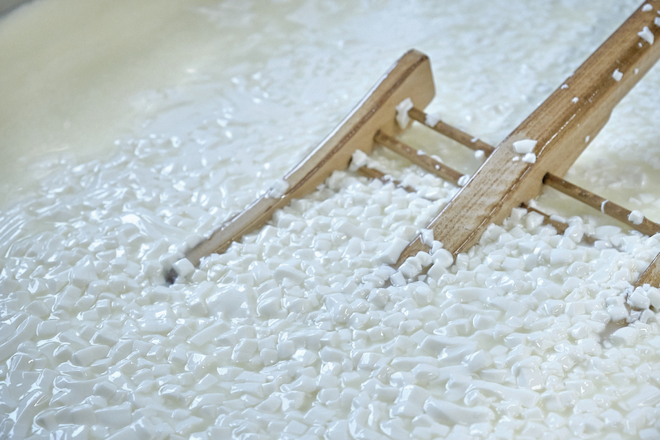 全体をサイの目に切り分けたものは「カード」と呼ばれ、これがさまざまなチーズづくりの出発地点になります。次に川島さんは、槽の中を木のヘラでやさしく撹拌。乳酸発酵が進み、収縮によってカードから水分が抜けていくのを、こうやって手助けしてやるのです。