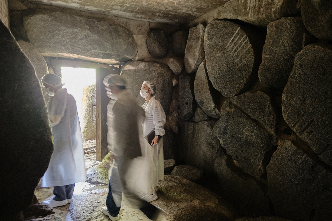 「午後の作業が始まるまでの間、ちょっと提携牧場にも行ってみましょうか」。そんな大家さんのお誘いに「ぜひ!」と答えた私たち。でもその前に、大家さんがちょっと面白い場所に案内してくださいました。それは工場の裏山に掘られた、大きな洞窟。内部には巨大な石ががっしりと組まれて、広々とした空間を保持しています。