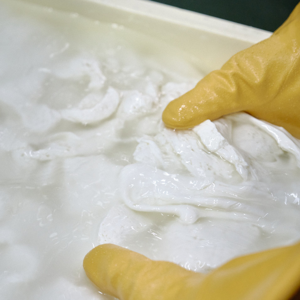こうして丁寧に丁寧に水抜きされたカードは、約2時間ほど寝かせるうちに、よりしっかりした大きな塊(工房ではこれを座布団と呼んでいます)に変わってゆきます。