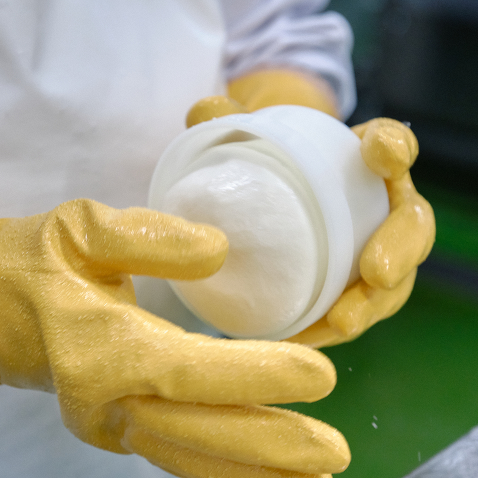 「こうやって揉むことでプロボローネ特有の粘りが出ます。そしたらタイミングを見計らってチーズを熱湯から上げ、1個ずつの重量を計って切り分けて、型に入れて成形するんです。これは時間との闘いなので、手が空いているスタッフ総がかりでやります」